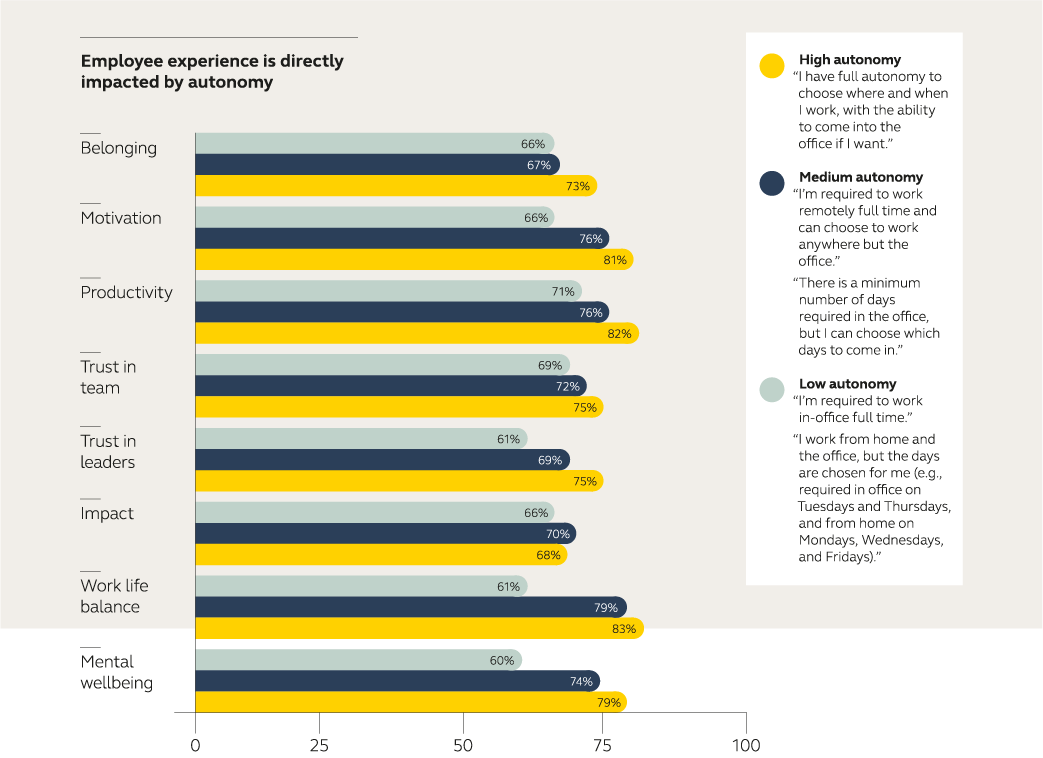 Jabras aktueller „Hybrid Ways of Working Report 2022“ hat erwiesen, dass die Mitarbeitenden, die selbst ihren Arbeitsort bestimmen können, zufriedener und glücklicher sind (siehe Grafik). 74 Prozent der deutschen Arbeitnehmenden, die selbst über das Wo und Wann ihrer Arbeit entscheiden dürfen, empfinden ihre Arbeitserfahrung als deutlich positiv. Dieser Anteil ist bei denjenigen, die eine mittlere oder geringe Arbeitsautonomie haben, signifikant niedriger – 70 bzw. 61 Prozent. Besonders offensichtlich werden diese Unterschiede beim Zugehörigkeitsgefühl, der Produktivität, dem Vertrauen in die Führungskräfte, der Work-Life-Balance und dem allgemeinen Wohlbefinden. Es sprechen also viele Gründe für die Einführung flexibler Arbeitsmodelle.